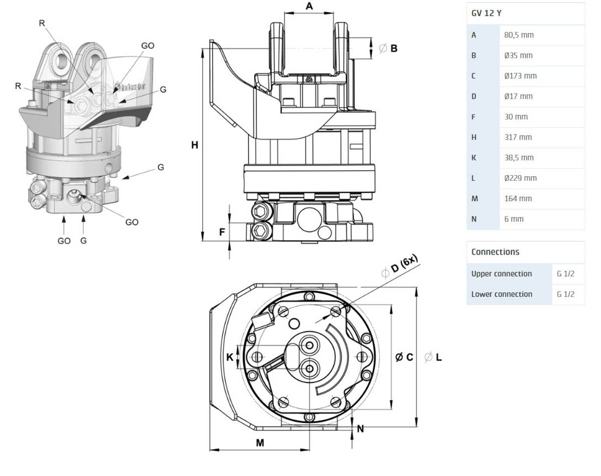 The Indexator GV12 Y rotator is designed for smooth rotation and precise handling of forestry grapples. With a lifting force of 100 kN, it ensures optimal reliability. Top connection: 80mm avec axe Ø35mm. Hydraulic inlets: 4 horizontales du même côté en G1/2. Hydraulic outlets: 2 verticales en G1/2 . Ideal for forestry and industrial applications.